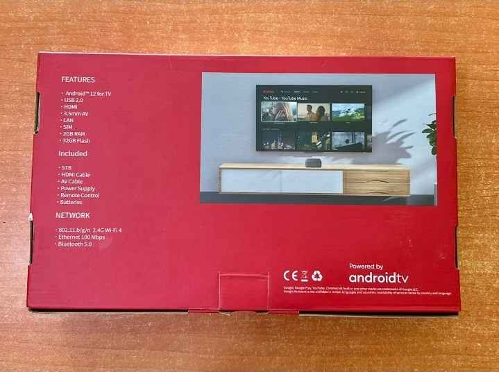 FEATURES: - AndroidTM 12 for TV - USB 2.0 - HDMI - 3.5mm AV - LAN - SIM - 2GB RAM - 32GB Flash Included: - STB - HDMI Cable - AV Cable - Power Supply - Remote Control - Batteries NETWORK: - 802.11 b/g/n 2.4G Wi-Fi 4 - Ethernet 100 Mbps - Bluetooth 5.0