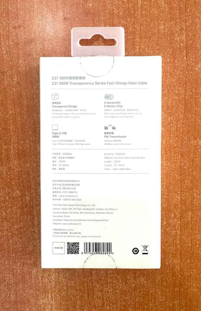 Product Parameters - Name: Z21 100W Transparent - Data Cable C TO C - Model: RCB0836 - Function: charging + data transmission - Power: 100W/6A (MAX) - Transmission rate: 480Mbps - Material: aluminum alloy + braided - Color: black - Length: 1.2m - Weight: about 44g net weight, 66g with package