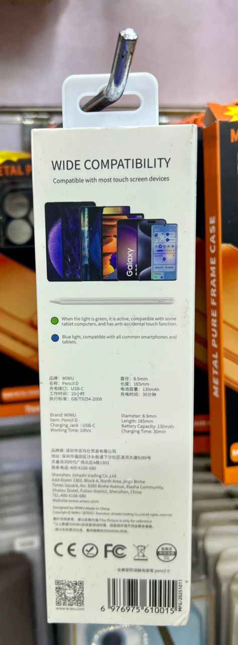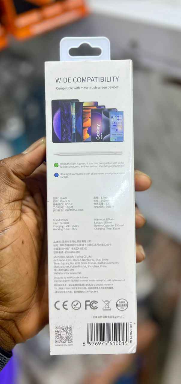 - Pencil D - Battery: 130mAh - Length: 165mm, size 165*9mm - Type C charging port - Charging time: 15 minutes - Working time: 8 hour - Universal pencil for ipad, iphone, android devices with palm rejection for ipad