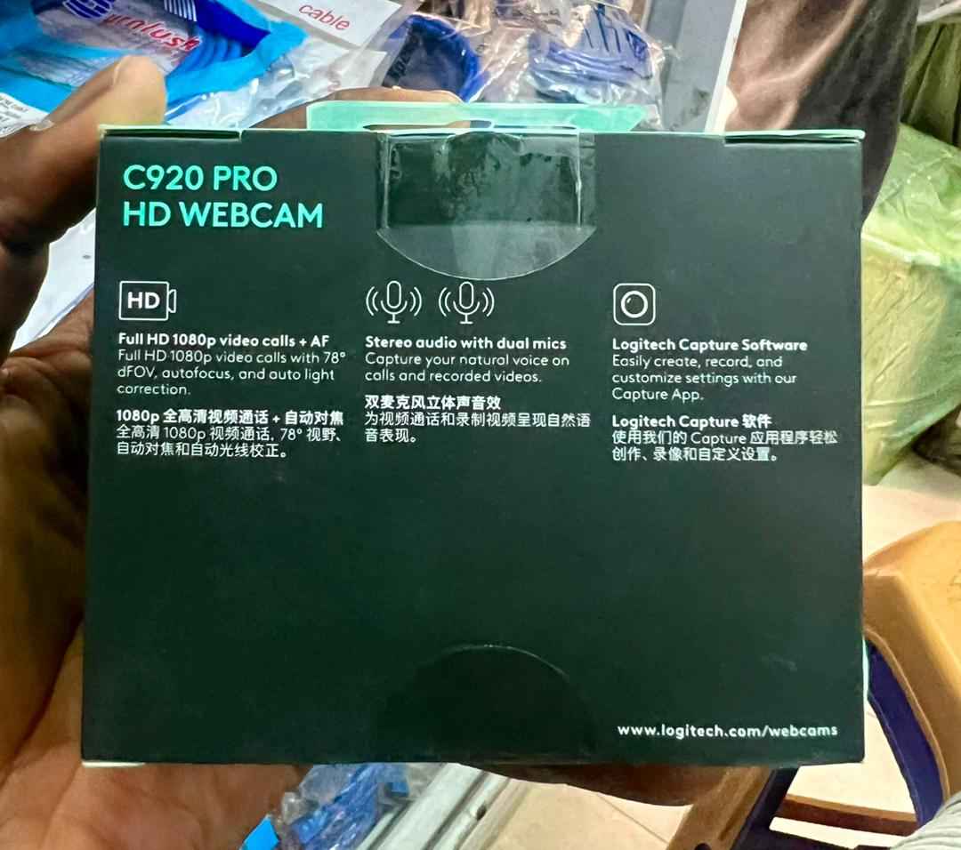 C920 Pro HD delivers remarkably crisp and detailed Full HD video with a full HD glass lens, 78° field of view, and HD auto light correction—plus dual mics for clear stereo sound. Technical Specifications - Max Resolution: 1080 p/30 fps - 720p/ 30 fps - Camera mega pixel: 3 - Focus type: Autofocus - Lens type: Glass - Built-in mic: Stereo - Mic range: Up to 1 m - Diagonal field of view (dFoV): 78° - Tripod-ready universal mounting clip fits laptops, LCD or monitors - Dimensions including fixed mounting clip - Height: 43.3 mm - Width: 94 mm - Depth: 71 mm - Cable length: 1.5 m - Weight: 162 g